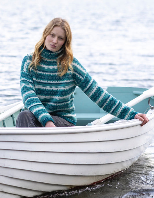 Fisherman out of Ireland Lambswool Fair Isle Funnel Neck Sweater in Emerald