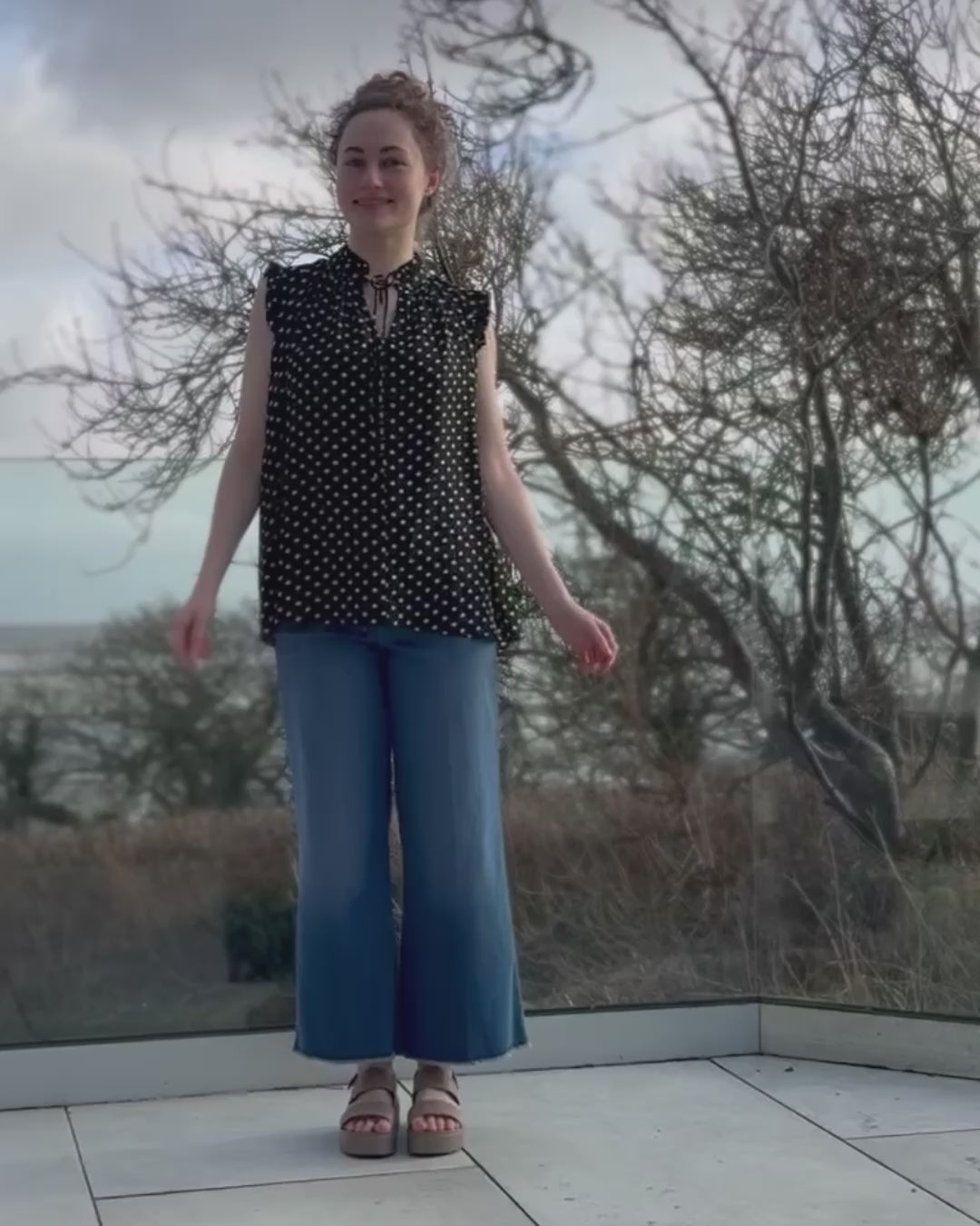 This floaty, lined top is perfect for summer with its sleeveless design and ruffle edge detail. The V neckline and black and white polka dot pattern make it a timeless choice. The kind of top that dresses up seamlessly with slacks or a skirt yet dresses down like a breeze with jeans and trainers.