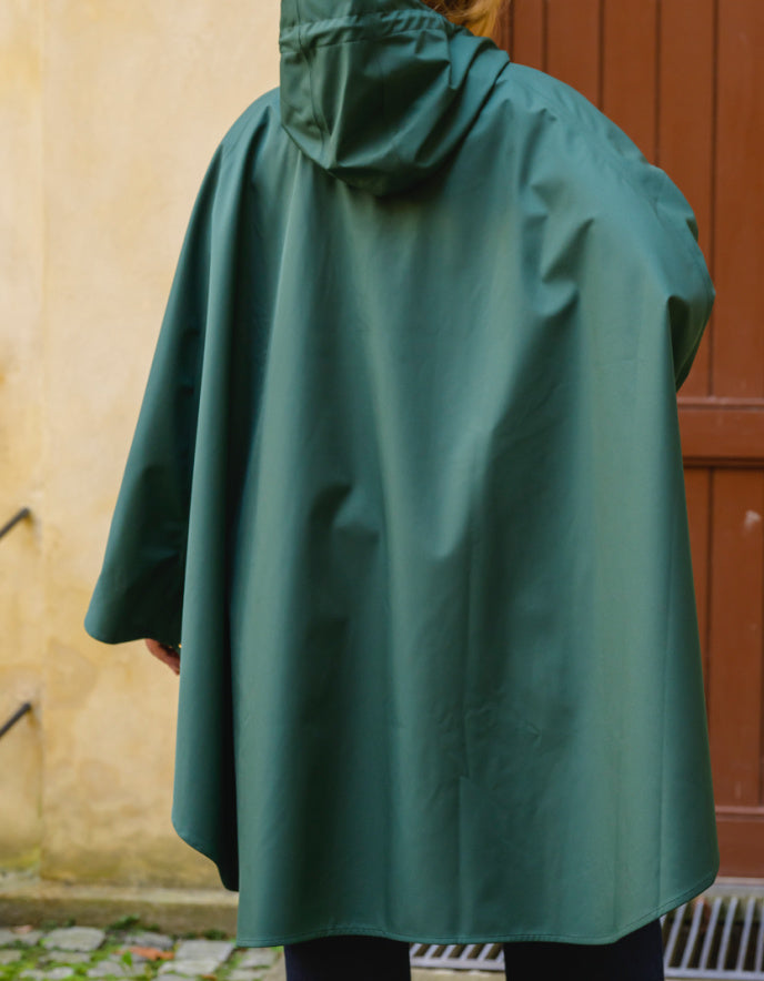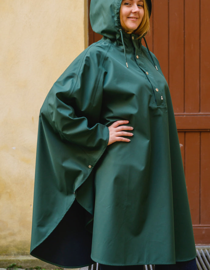 The Danefae Danerain Poncho in Dark Forest features a soft, stretchy fabric that offers comfort and flexibility. Its oversized design provides ample coverage, while the placket opening at the neck with silver poppers makes it easy to wear and adjust. Equipped with a hood and adjustable drawstrings, this poncho helps keep you dry and warm in changing weather. Taped seams ensure reliable protection from rain, making it a practical and cozy outer layer for damp days.