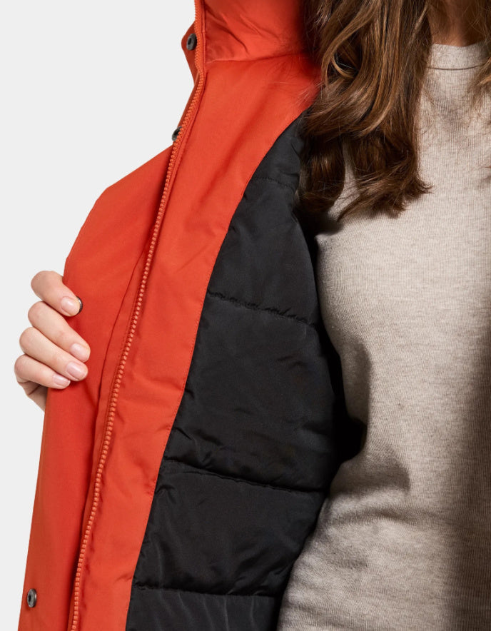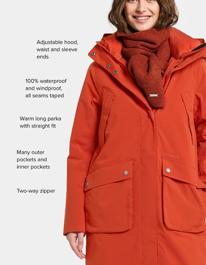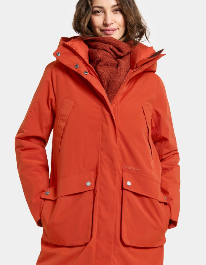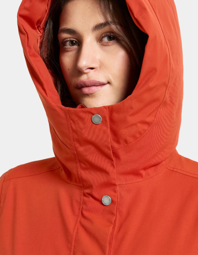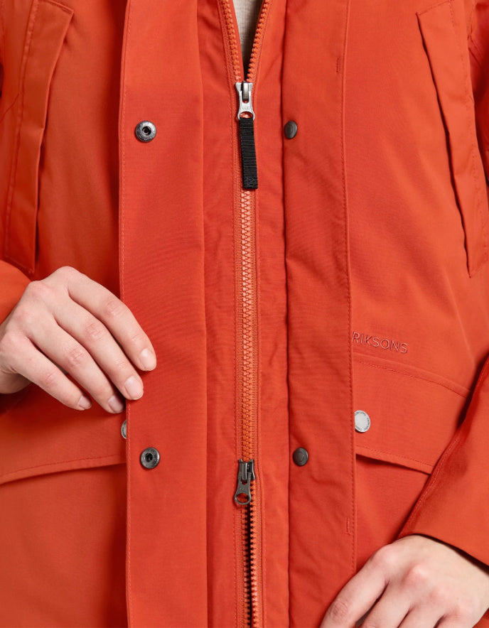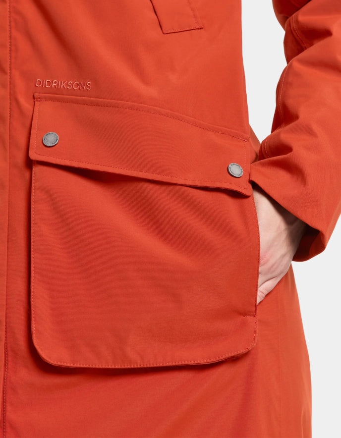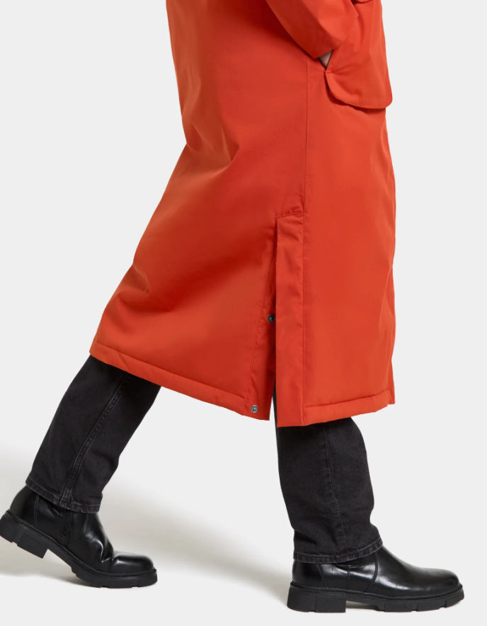 The Didriksons Melody Parka in Rust is a wonder for winter. A waterproof and windproof padded coat, featuring taped seams and breathable fabric to keep you comfortable. Its straight fit includes an adjustable hood and a two-way front zip with buttoned placket for added weather resistance. With six outer pockets, including hand warmer and chest pockets, it provides ample storage. The collar lining is padded and the cuffs are elasticated and the waist can be adjusted with a drawstring for a personalised fit, and the side slits provide extra freedom of movement.