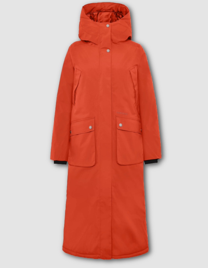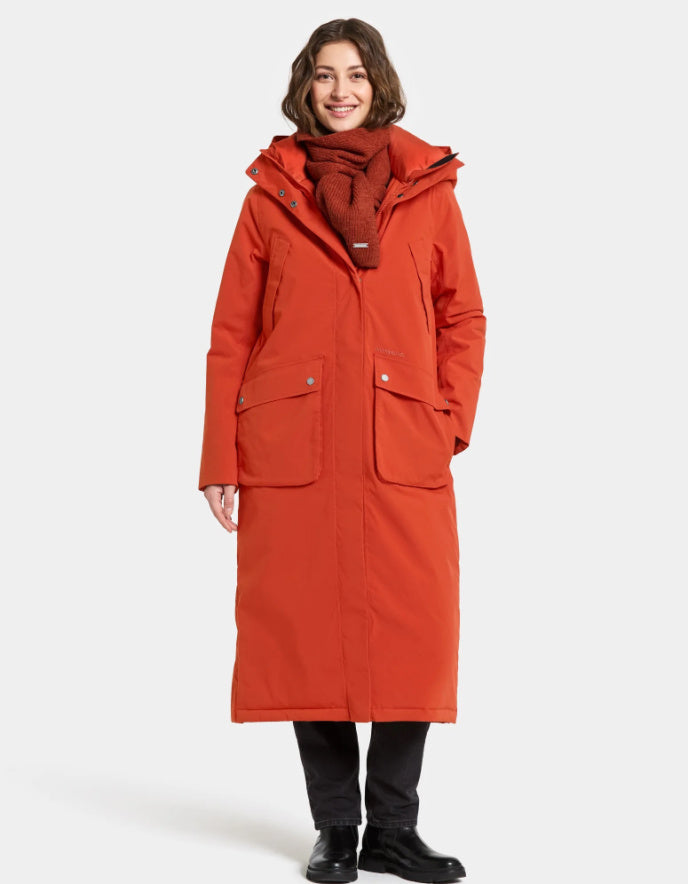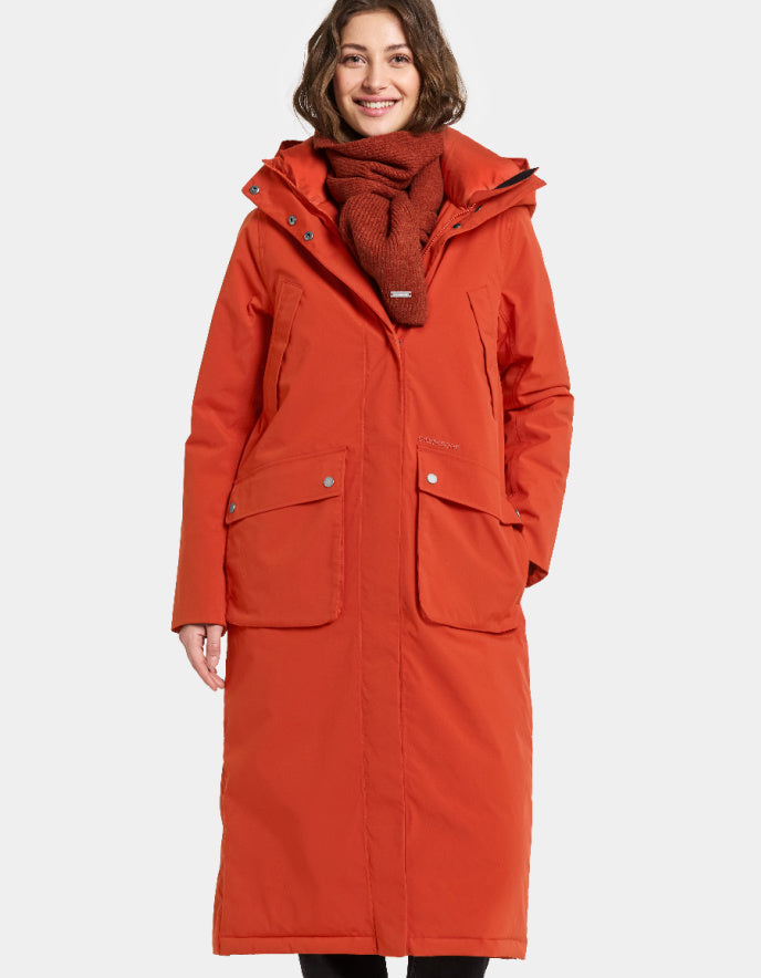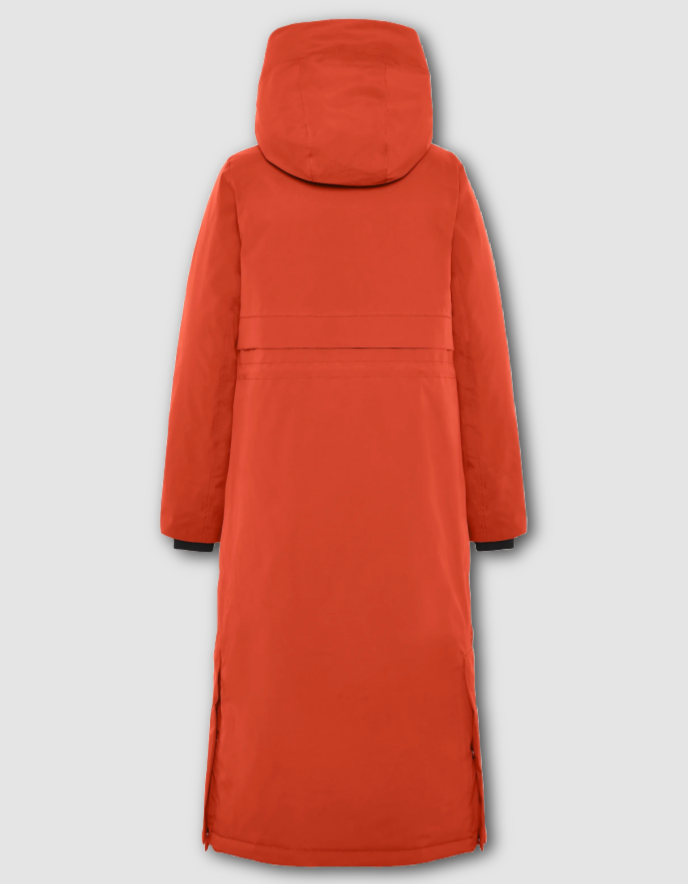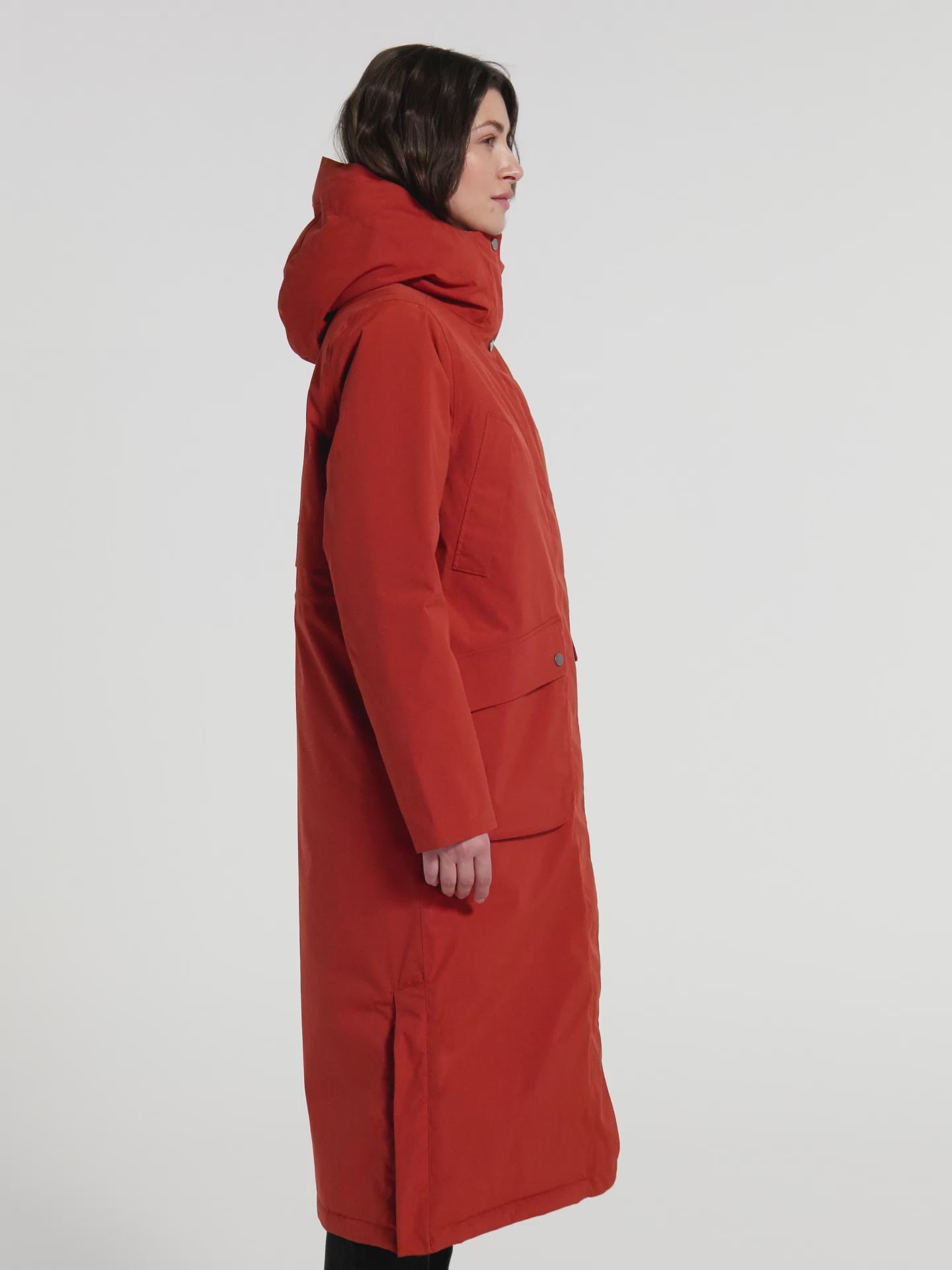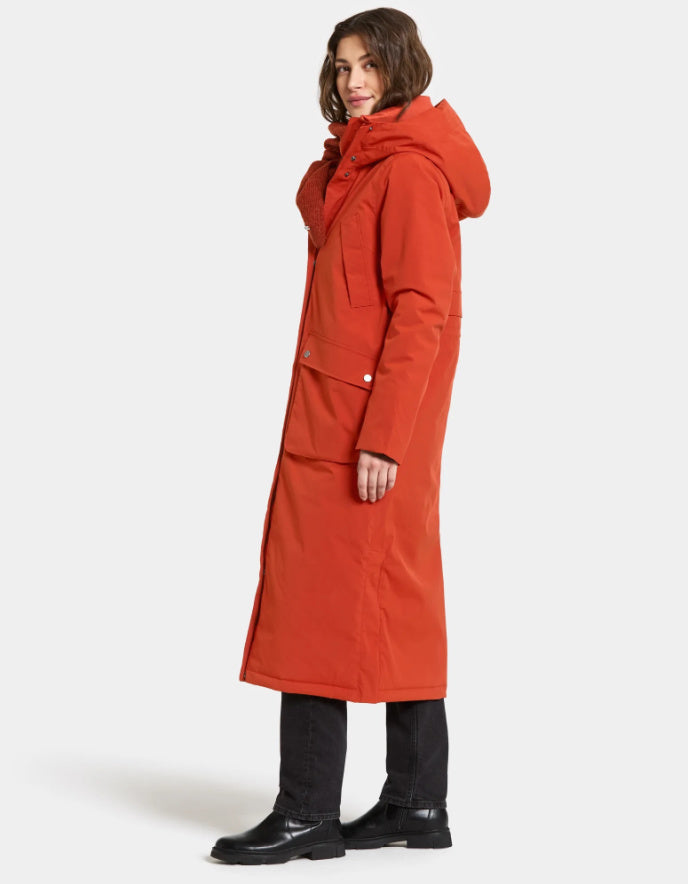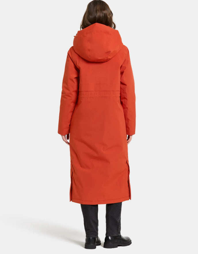 The Didriksons Melody Parka in Rust is a wonder for winter. A waterproof and windproof padded coat, featuring taped seams and breathable fabric to keep you comfortable. Its straight fit includes an adjustable hood and a two-way front zip with buttoned placket for added weather resistance. With six outer pockets, including hand warmer and chest pockets, it provides ample storage. The collar lining is padded and the cuffs are elasticated and the waist can be adjusted with a drawstring for a personalised fit, and the side slits provide extra freedom of movement.