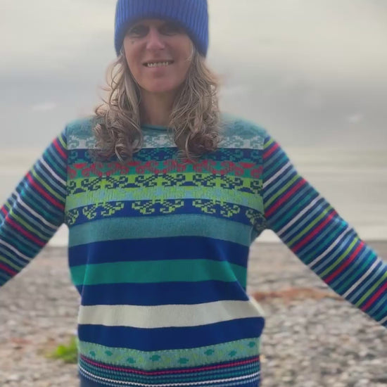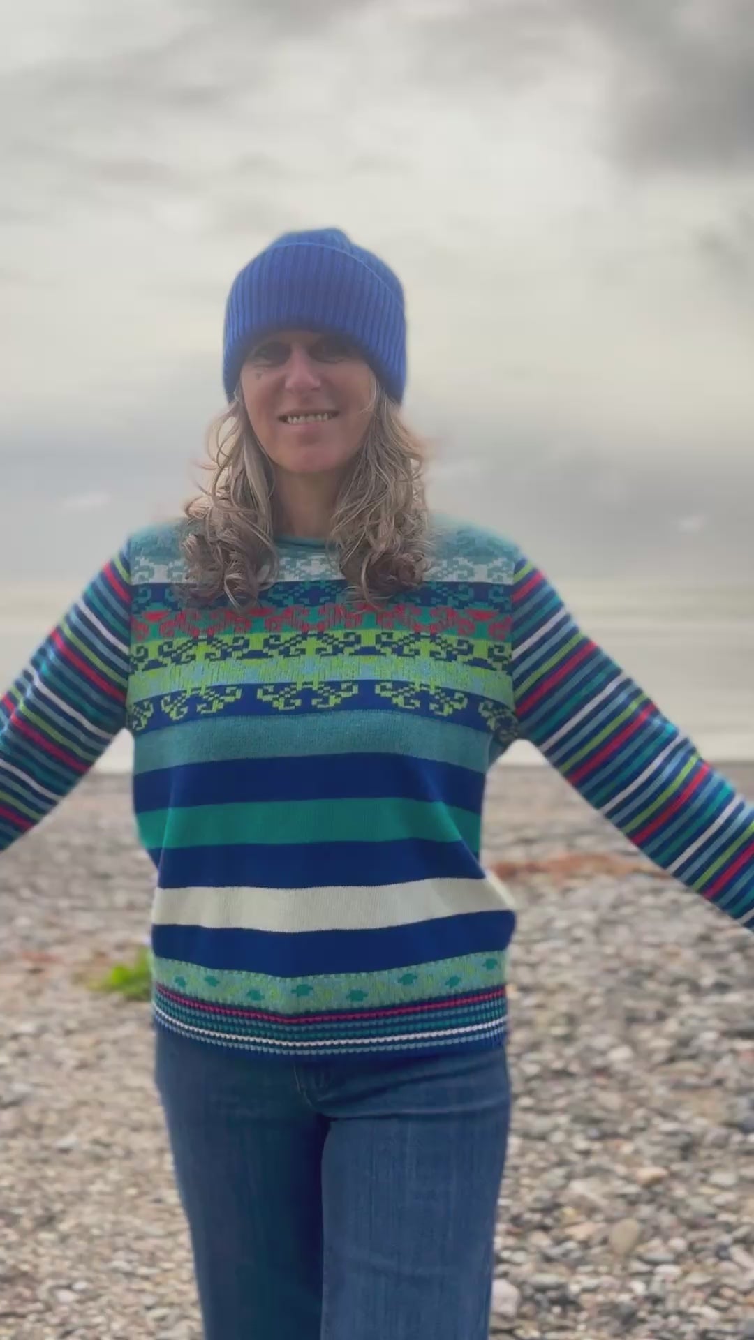 This crew neck sweater features a regular fit with bold block contrast stripes on the body and joyful mini stripes along the sleeves. Finished with a comfortable roll-over neckline, ribbed hem, and cuffs, and it finished at the top of the hip. If you love a stripe this is the one for you