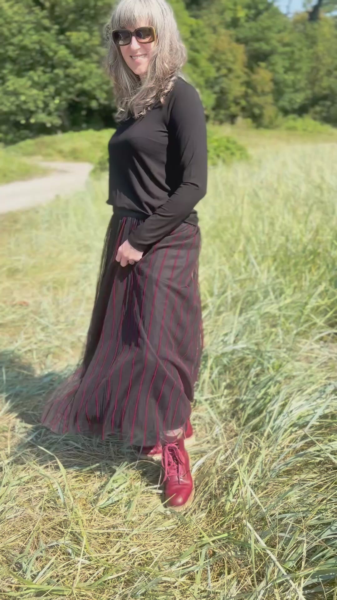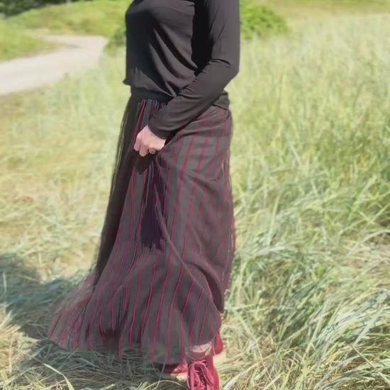 The Luukaa Siana Woven Skirt features a comfortable elasticated waist and a flowing design perfect for twirling. Its outer mesh layer is lined and detailed with striking red pinstripes. Ideal for special occasions, this skirt offers both comfort and a playful touch.