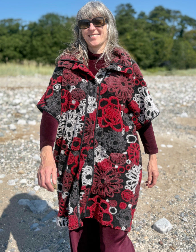 A unique coat option from Luukaa. The Sorelle coat offers a very wide, oversized fit for a completely relaxed yet put together look. Featuring a stand-up collar and front popper closure with an eye catching red and grey woven floral design. The sleeves unzip to transform the coat into a long gilet, adapting to changing temperatures and looks. A very fun piece to wear