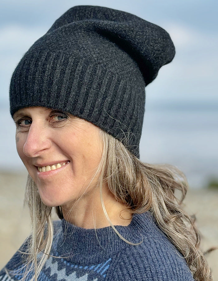 Loose fit beanie hat that can be worn floppy or neat if you roll up the trim. Made in moss stitch with a ribbed hem.