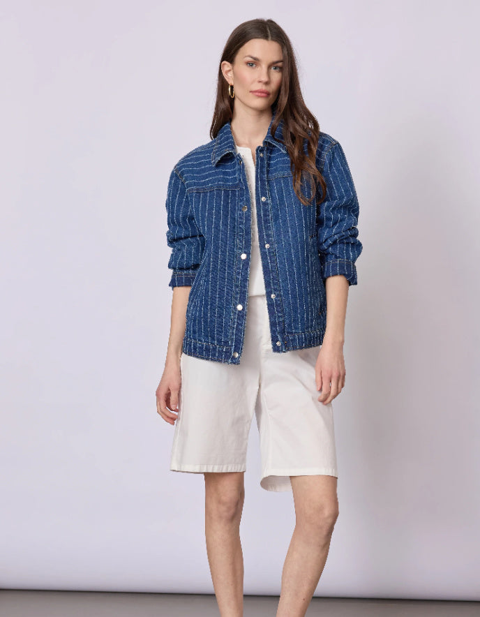 A timeless denim jacket reimagined with contemporary flair. This classic piece features striking stitch detailed stripes that create a distinctive visual edge, elevating everyday style. The popper closure ensures a secure fit, while practical side pockets add functionality to the design. Perfect for layering over any outfit, this jacket combines traditional denim durability with modern detailing for a look that stands out.