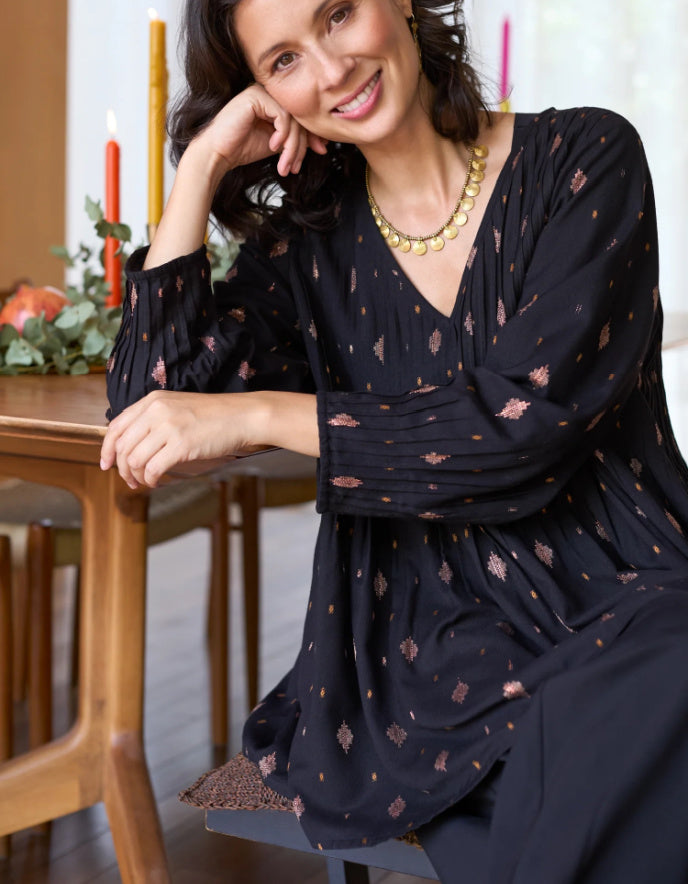 The Sahara Diamond Lurex Pleated Top combines effortless comfort with subtle glamour. Its loose fit and V neckline offer a flattering, relaxed silhouette, while roomy sleeves with pleated cuffs provide freedom of movement and added style detail. The shimmering diamond woven design adds a touch of elegance, perfect for elevating any outfit with a gentle sparkle.