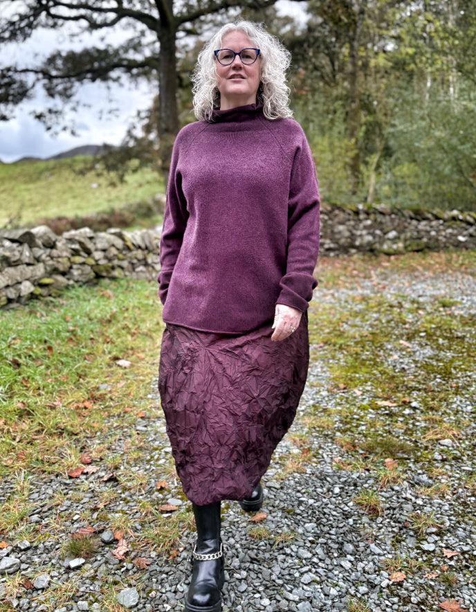 This Vetono Bubble Skirt combines style and comfort with its unique bubble hemline creating a charming soft puffball effect. Crafted from soft crinkle taffeta in a rich dark red, it feels fancy. The soft turnover waistband ensures a comfortable fit, while handy pockets add practical elegance. Perfect for making a statement with ease, this midi-length skirt brings a playful yet refined touch to your wardrobe.